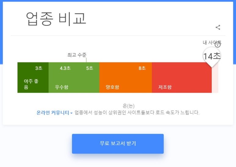 이번 테스트에서 나름 괜찮은 것은, 유사사이트와의 비교분석입니다. 내 사이트와 타 유사 사이트와의 기준치를 비교하여 어느정도 더 빠른지 느린지를 가늠할 수 있습니다.