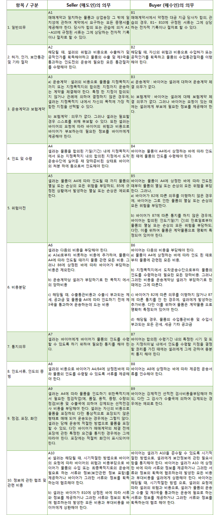 A는 셀러(매도인)의 의무를, B는 바이어(매수인)의 의무를 구분합니다. 표로 표시되어 항목별로 정리되어 있으니 이 표는 필요할 때에 참고하시면 되겠습니다.