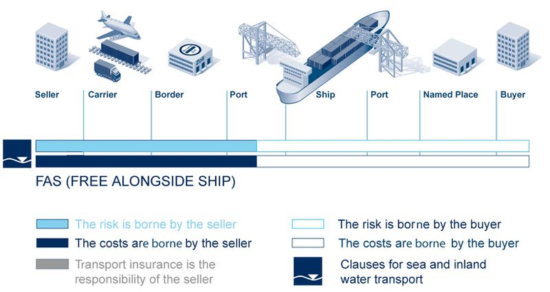 즉, 바이어는 항구까지의 내륙 운임과 선측까지의 부두 운임을 부담합니다. 선측에서의 선적비용은 바이어가 부담하는 것이며, 지정선적항에서 본선의 선측에 물품을 인도할 때에 셀러의 위험과 비용부담은 종료됩니다.
