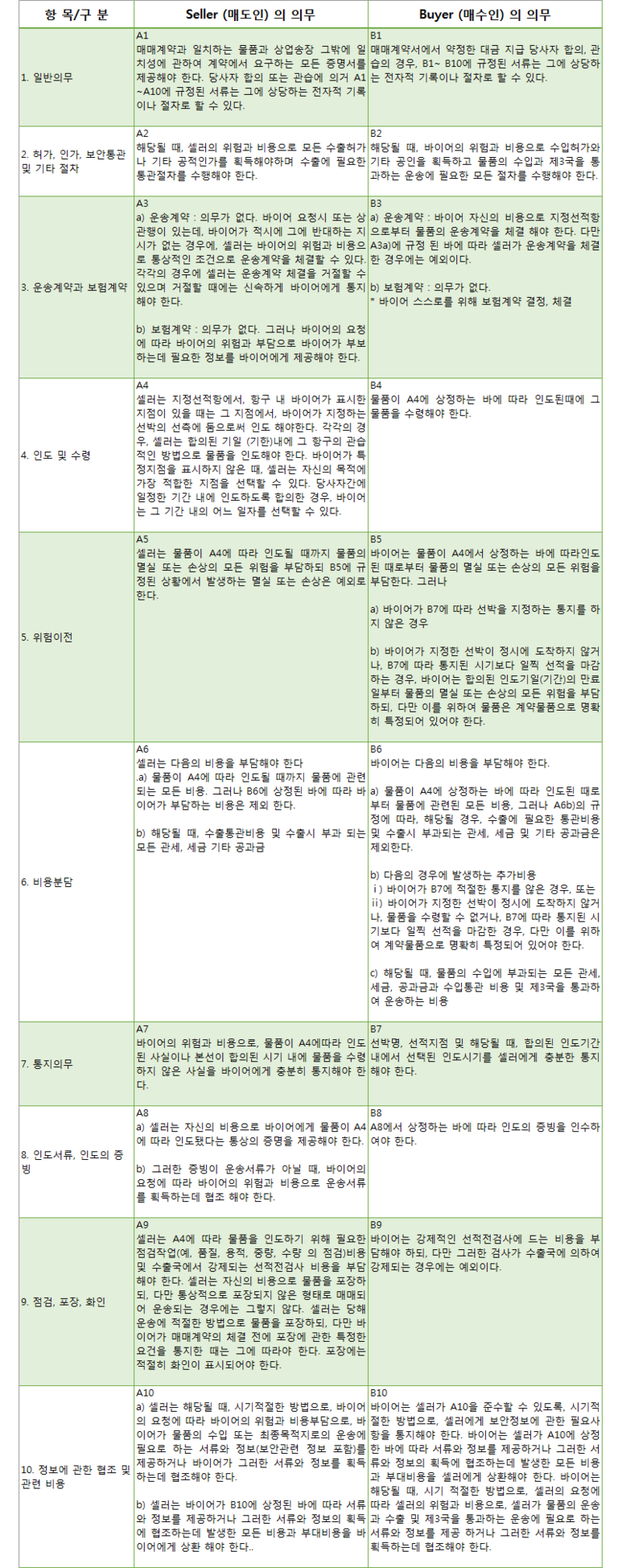 A는 셀러(매도인)의 의무를, B는 바이어(매수인)의 의무를 구분합니다. 표로 표시되어 항목별로 정리되어 있으니 이 표는 필요할 때에 참고하시면 되겠습니다.