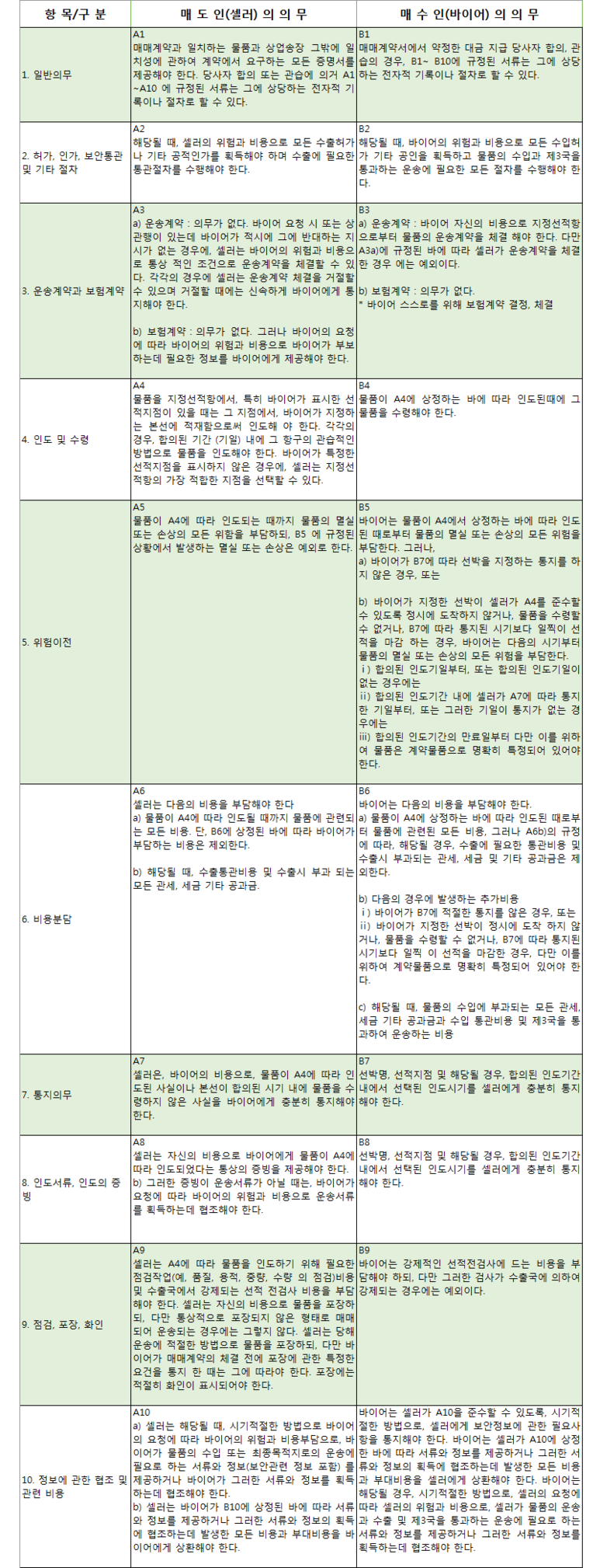 A는 셀러(매도인)의 의무를, B는 바이어(매수인)의 의무를 구분합니다. 표로 표시되어 항목별로 정리되어 있으니 이 표는 필요할 때에 참고하시면 되겠습니다.