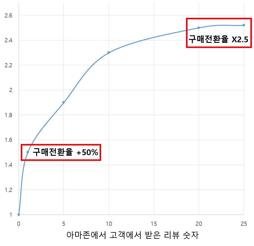 하지만, 제품을 구매하려고 상품페이지에 방문한 사람들에게 가장 영향을 주는 것은, 제품을 먼저 사용해본 사람들이 달아둔 리뷰라고 할 것입니다. 아마존 통계를 보면, 리뷰가 없는 제품보다 리뷰가 한개라도 있는 제품의 구매전환율이 50% 증가를 하였으며, 리뷰가 20개 이상 있으며 구매전환율이 250%이상의 영향을 미치고 있습니다.
