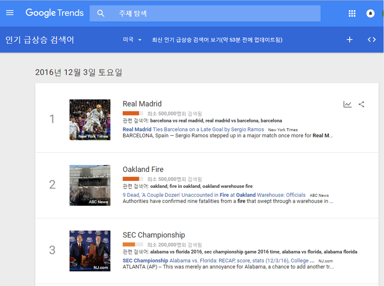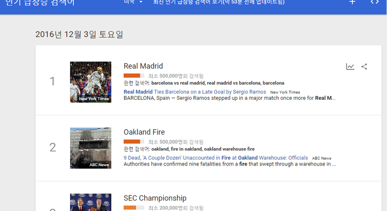 구글 트렌드는 여러모로 활용도가 높습니다. 검색어의 관심도를 비교하는 방법을 많이 사용하지만, 우리나라 포털 사이트의 실시간 검색어 순위와 비슷한 자료를 보여줍니다. 물론 우리나라처럼 조작을 하지는 않는다는 장점이 있겠지만, 단순 검색어로 트렌드를 파악하기는 어려움이 있습니다.