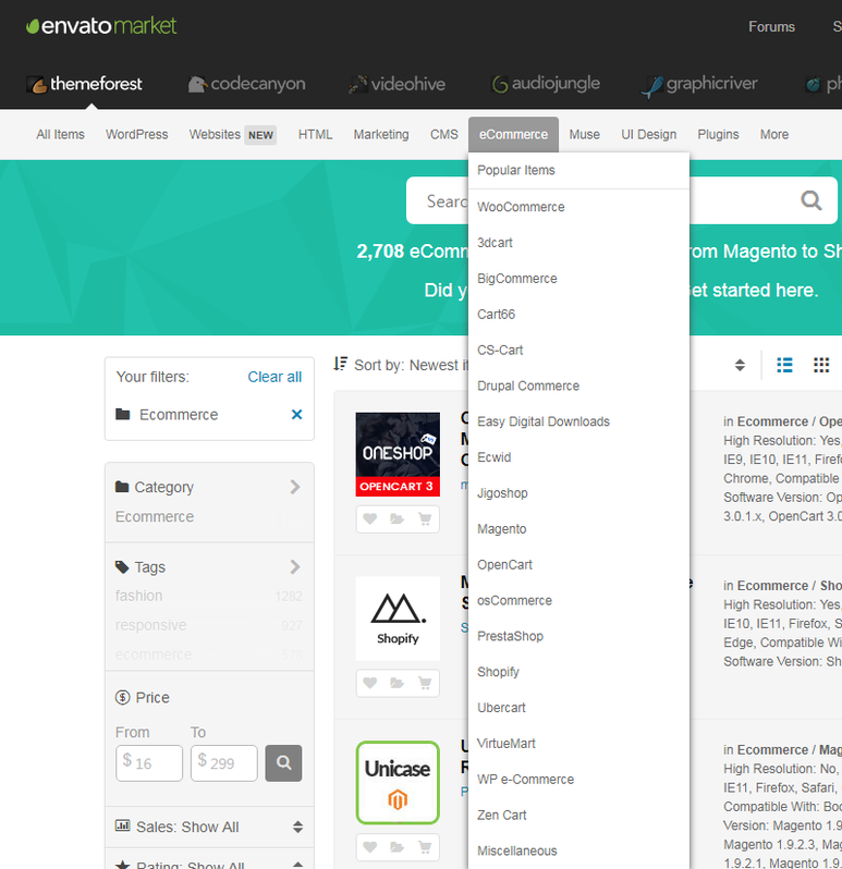 Themeforest.net은 Envato market 이라는 사이트에서 운영하는 여러 마켓 중 하나입니다. Themeforest는, 그 이름에서도 알 수 있듯이 Theme, 즉 웹사이트의 테마를 사고 팔 수 있는 사이트입니다. 개발자가 테마를 제작하고 위의 사이트에서 판매하게 되면 구매자는 가입, 결제 후 해당 테마를 사용할 수 있습니다. 흔히 Wordpress의 테마를 구매하기 위해 많이 방문하지만 Wordpress 쇼핑몰 플러그인 WooCommerce 외에도 Magento, Shopify, PrestaShop, BigCommerce, CS-Cart 등등, 여러 e-Commerce 의 테마들을 찾을 수 있습니다.