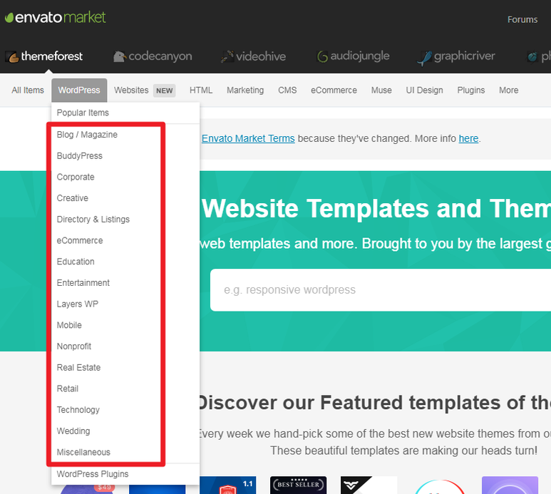 또한 Themeforest는 envato market의 일부이기 때문에 themeforest 외에도 Codecanyon, Videohive등의 웹사이트 제작이나 운영에 필요한 각종 소스, 사진, 3D모델, 플러그인, 음악, 비디오 등, 여러 기능들을 구매할 수 있는 다른 마켓도 이용할 수 있습니다.