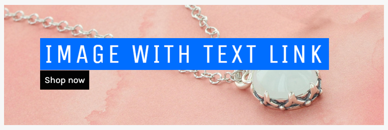 – Image with text link : Image 파일과 텍스트가 노출되며, 해당 텍스트 클릭 시에 미리 지정한 링크 (상품, Collection등)로 이동합니다. 상단의 Slide와 비슷하지만 움직이지 않는 상태라고 이해하면 쉽습니다.