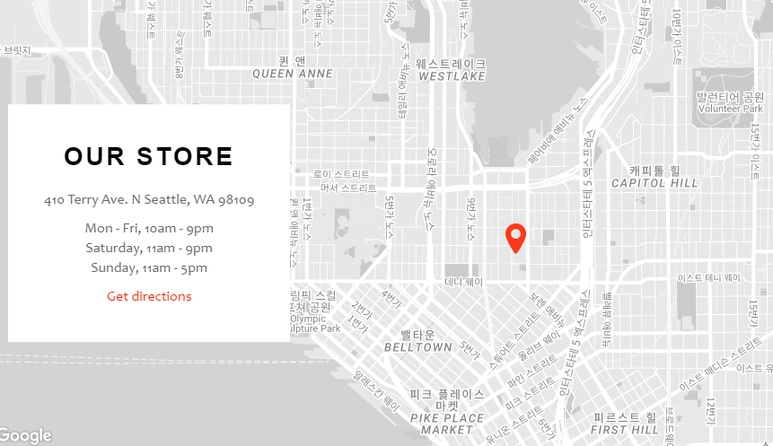 – Map : Google map으로 회사의 위치를 표시할 수 있습니다. 주소를 넣으면 사용할 수 있습니다.다만하루 노출이 2,500건 이상일 경우 API키를 입력해야 합니다. 회사 소개나 Contact Us page 가 아닌 이상, Store 메인 페이지에 지도를 노출하는 경우는 많지 않습니다.