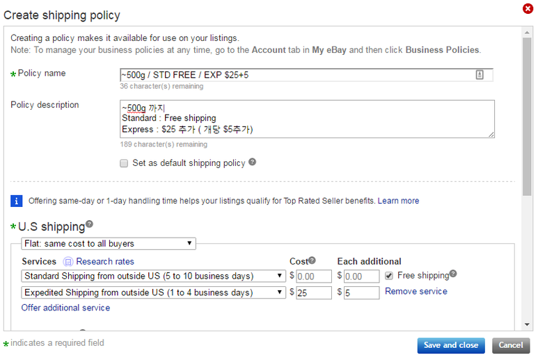 eBay 배송설정의 경우, 배송속도와 금액을 지정하고 배송 국가와 제외 국가를 지정하여 하나의 Shipping Policy (배송정책)을 만듭니다. 이 경우 좋은 점은 리스팅 할 때 마다 부피나 무게를 감안하여 이미 만들어진 배송 정책을 사용할 수 있고, 같은 Shipping Policy 를 사용하는 제품군의 경우엔 일괄적인 배송정책 변경을 쉽게 할 수 있습니다. 하지만 설정을 세세하게 할 수 있다는 점은 때로는 복잡함으로 다가올 수 있는 아쉬움이 있습니다.