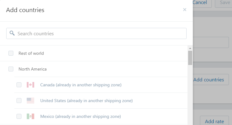 참고로, 아래와 같이 다른 Shipping Zone에서 이미 지정한 국가는 선택할 수 없게 비활성화 되어있습니다.