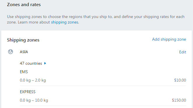 Shopify는 해외 쇼핑몰이기 때문에 글로벌 배송을 기본으로 합니다. Domestic(국내배송)과 International (국제배송) 파트로 나뉘며, 국제 배송의 경우는 각 국가나 대륙 별로 상세하게 설정 가능합니다. 쉽게 본다면 eBay와 비슷하게 보이기도 하지만 개인적으로는 eBay보다는 좀 더 쉬운 느낌입니다.