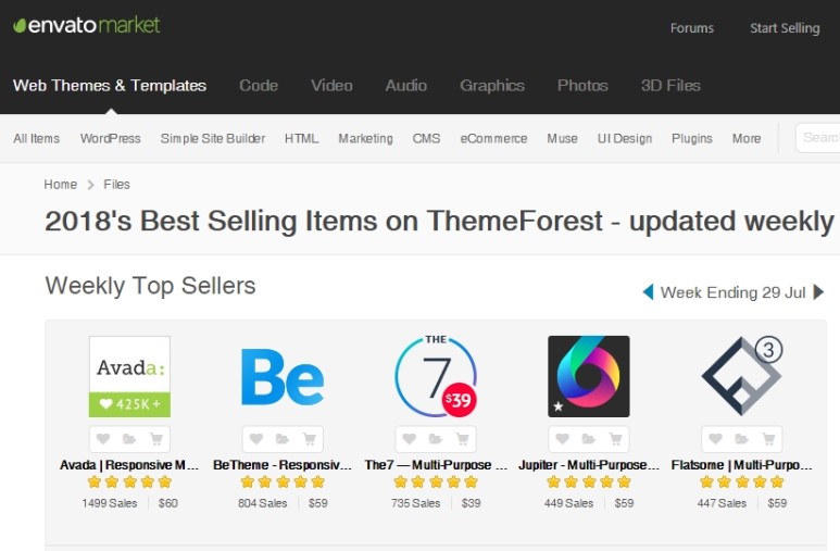 혹은 Web Themes & Templates 의 All Items 항목의하위메뉴인 Popular Files 메뉴에보면, 주단위 3개월단위등의기간동안 Best Seller 제품군을볼수있습니다. 이곳에나온테마들은 Woocommerce의기능은기본으로지원하여, 쇼핑몰외에도회사홈페이지, 원페이지등등, 여러가지웹페이지를만들수있는 Multi Purpose Theme 임을강조하고있습니다. 당장에쇼핑몰을열기보다는회사홈페이지구축이우선인경우, 여러목적에따라홈페이지를구성할수있는 Multi Purpose 테마를사용하는것도좋은방법입니다.