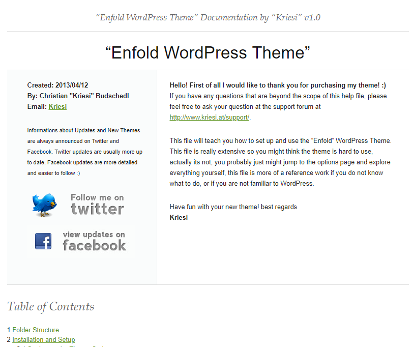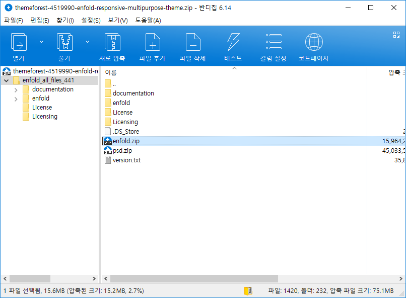 생각보다 큰 용량의 압축파일입니다. 그 안에 있는 enfold.zip 파일만 있으면 테마 설치가 가능합니다. 테마 파일만은 15.6MB입니다. Documentation 폴더의 압축을 풀어 documentation 파일을 열면 폴더 제작사의 설명 웹페이지로 연결됩니다.