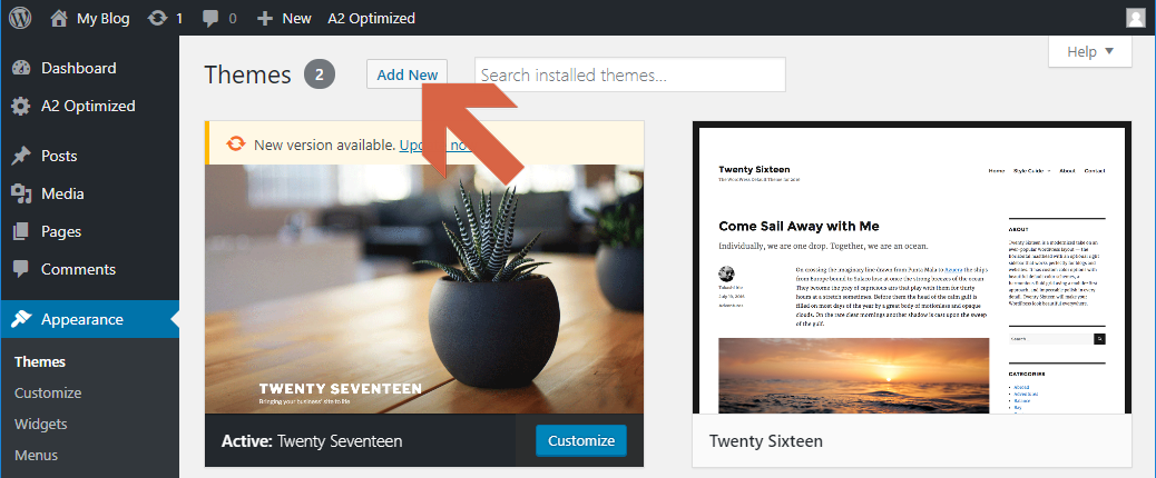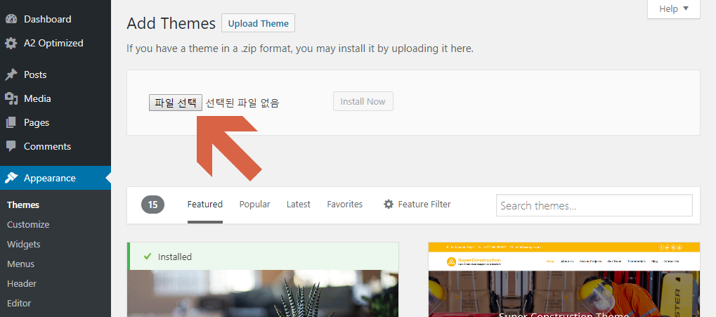 테마는 관리자 화면의 Appearance – Theme 메뉴에서 가능합니다. 한글로는 외모–테마 가 되겠죠.