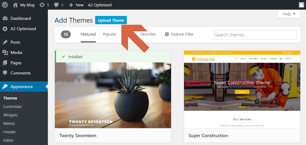 현재사용중인테마가나오는데, 여기서다시상단의 Upload Theme를클릭합니다.