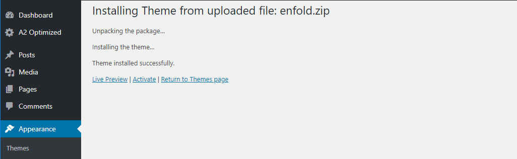 업로드가 잘 되고, 설치가 완료되면 Theme installed successfully. 라는 메시지가 출력됩니다.