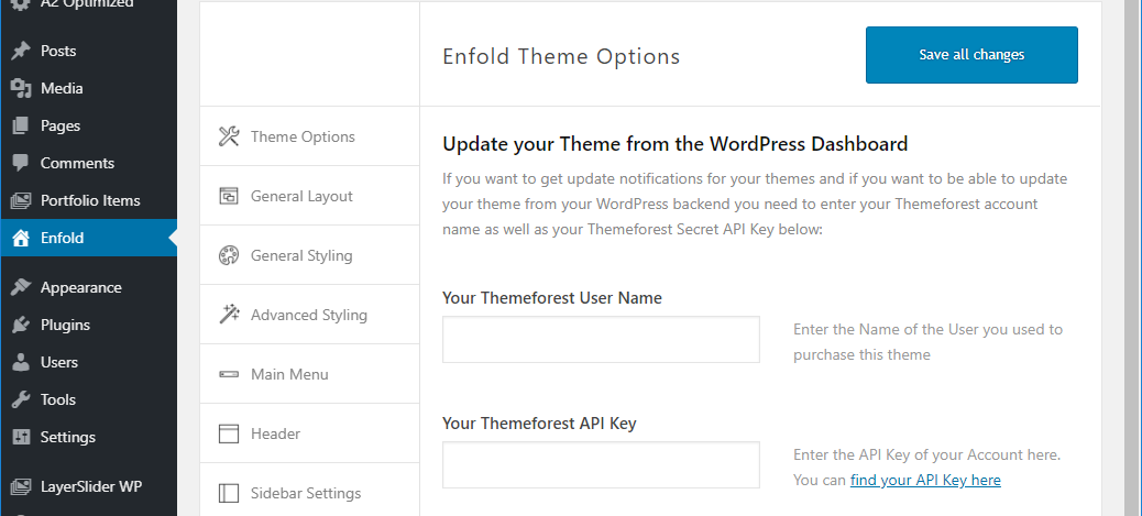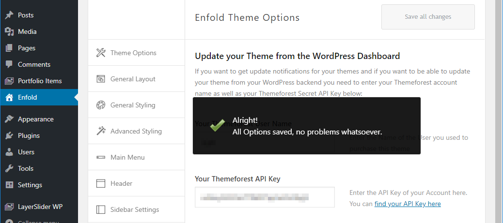 테마를 구매한 Themeforest 에서 User name 과 API Key를 입력해야 하는데
