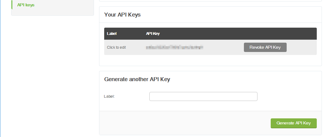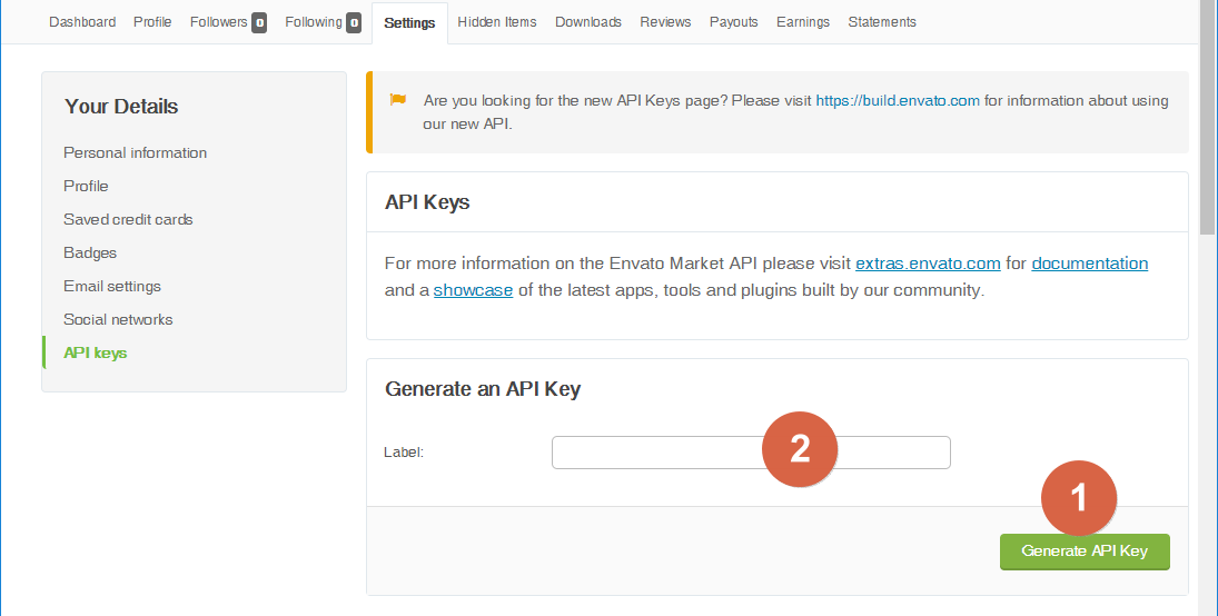 Themeforest 에 로그인 후, 오른쪽 위의 본인의 ID를 클릭하여 Setting으로 가면 API keys 메뉴를 찾을 수 있습니다. 처음에는 API키가 없기 때문에 Generate API key를 클릭하여 키값을 생성합니다.