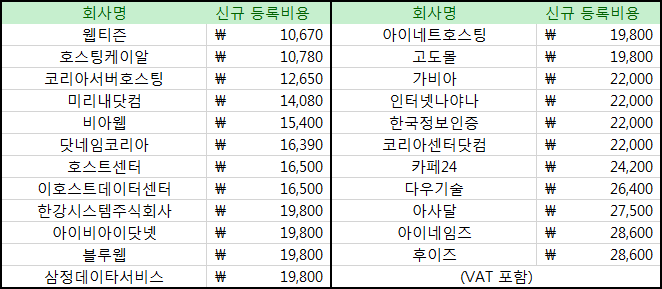 아래는 몇몇 국내 업체의 도메인 등록비용을 표로 만들어 봤습니다.