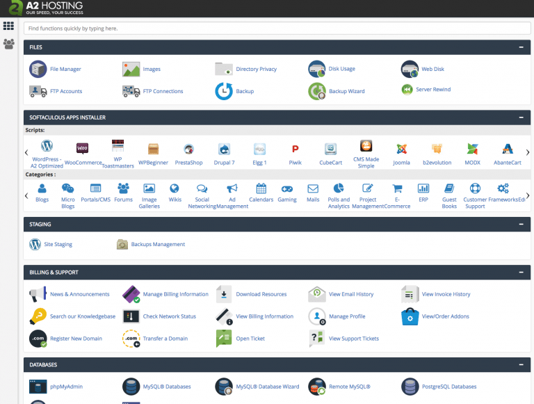 <파일관리,워드프레스 등의 솔루션 설치, 이메일 관리 등, 많은 부분을 확인할 수 있습니다 A2hosting>