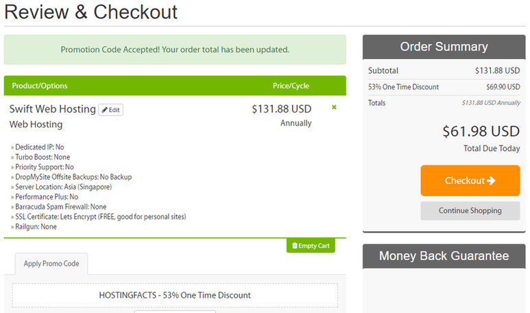 항상 써 있는 Money Back Guarantee는 괜히 언제든 취소할 수 있다는 느낌을 줍니다. 물론 대부분 한 번 결제하면 취소하지 않고 가능 경우가 많긴 합니다. Promo code로 HOSTINGFACTS를 입력하면 조금이나마 더 저렴한 (51%->53%)로 결제가 가능하네요.