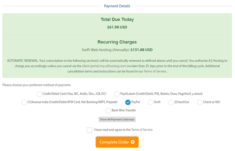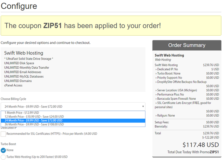 위에서 언급했듯이, 국내도 마찬가지지만 해외도 함정이 많아, 원치 않는 구매 옵션도 포함되는 경우가 많은 부분을 항상 확인해야 합니다. 그나마 a2hosting은 옵션 항목에 default 값으로 None으로 대부분선택되어 있습니다. 또한 여기서 가격에 대한 변화를 볼 수 있는데, 프로모션 코드 적용 전의 가격은 $9.99이고 적용 후의 가격이 매월 $4.90입니다. 그런데 이 가격은 24개월 플랜을 선택했을 경우이고, 12개월 플랜을 선택하면 총액은 $64.62로 대략 월 $5.4의 가격으로 서비스를 이용하게 됩니다. 24개월이나 36개월의 가격만 제대로 할인하는 느낌입니다. 이럴 때에는 보통 24개월로 진행하는 경우가 많습니다.